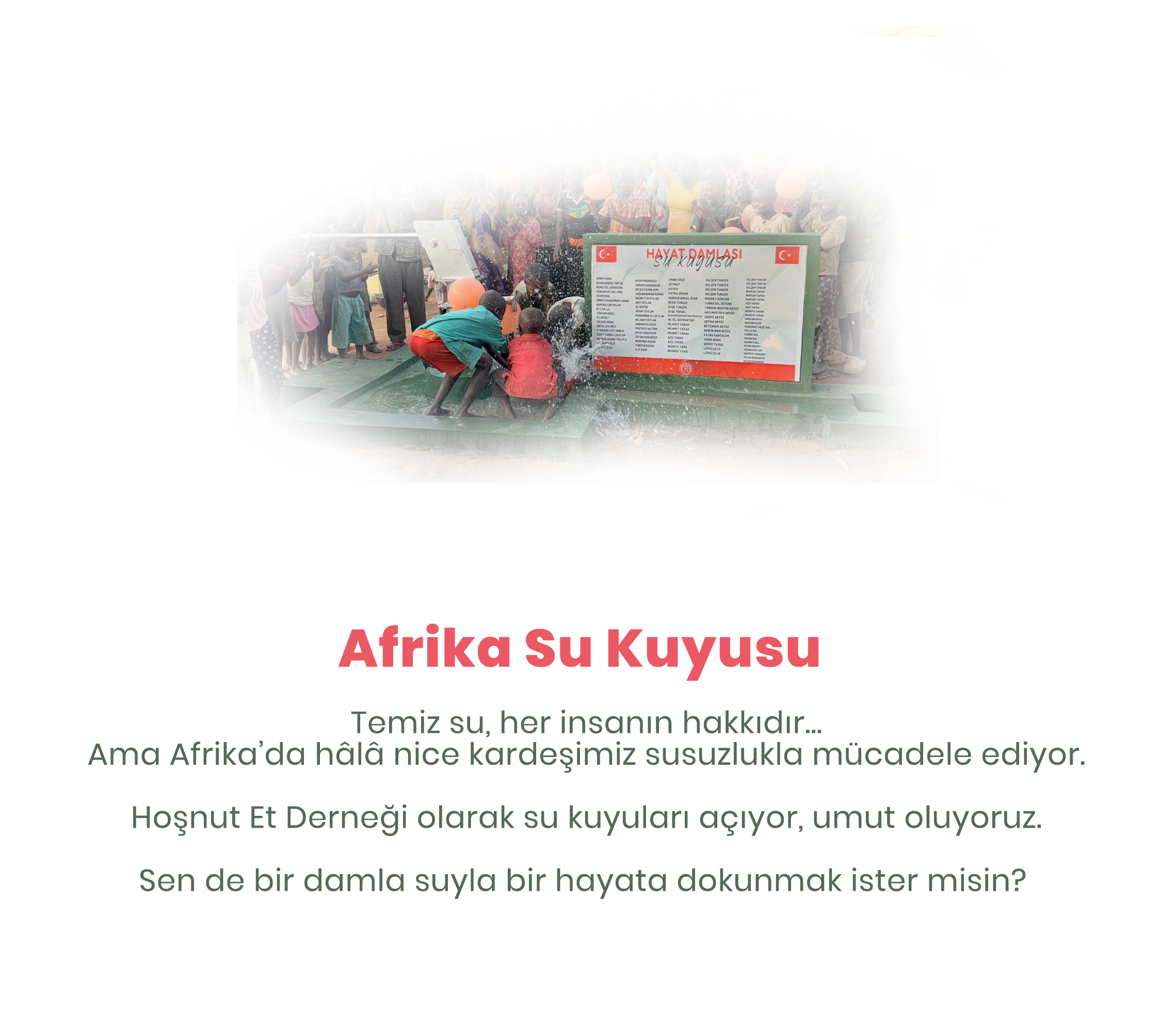 Afrika’nın birçok bölgesinde temiz ve güvenilir suya ulaşmak hala en temel sorunlardan biri olmaya devam ediyor. Su kaynaklarının yetersizliği, insanların yaşam koşullarını olumsuz etkilediği gibi sağlık, eğitim ve ekonomik faaliyetlerde de büyük sıkıntılara yol açıyor. Hoşnut Et Derneği olarak, suyun bir yaşam hakkı olduğuna inanıyor ve temiz suya erişim sağlayacak projelerle insanlara umut olmaya devam ediyoruz.